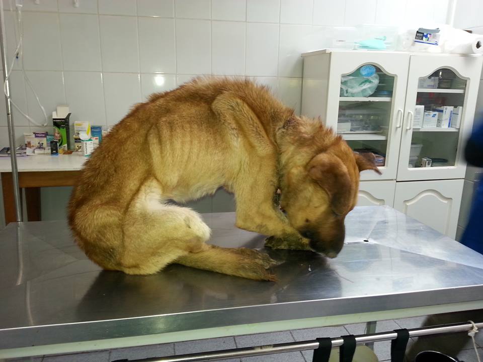 Este animalito también era cruelmente golpeado, pero tras la denuncia se encuentra en una clínica veterinaria luchando por su vida.