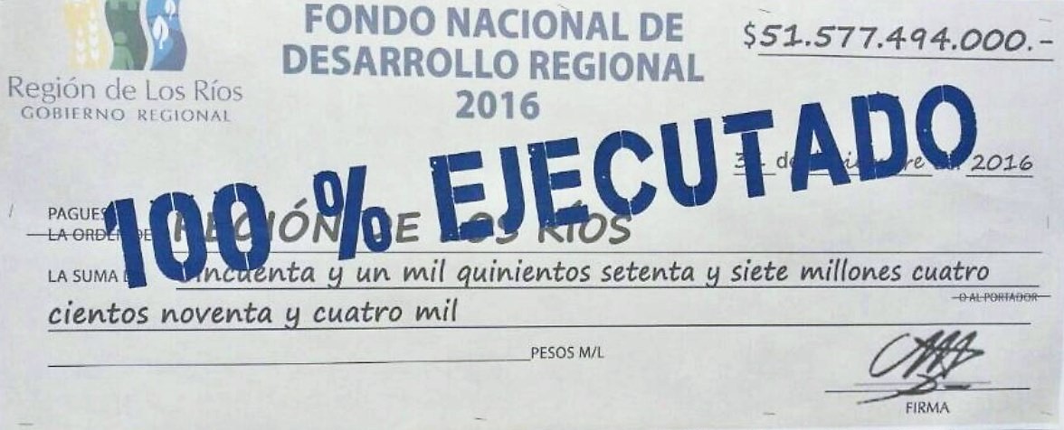 El intendente Egon Montecinos informó que, por tercer año seguido, el Gobierno Regional de Los Ríos alcanzó el 100% de la ejecución del presupuesto del Fondo Nacional de Desarrollo Regional (FNDR) del año 2016. “Durante esta semana recibimos la confirmación de la noticia que por tercer año consecutivo cerramos el año presupuestario con el 100% de ejecución de nuestro presupuesto regional, lo cual es una muy buena noticia porque viene a ratificar el trabajo de hace tres años”.
