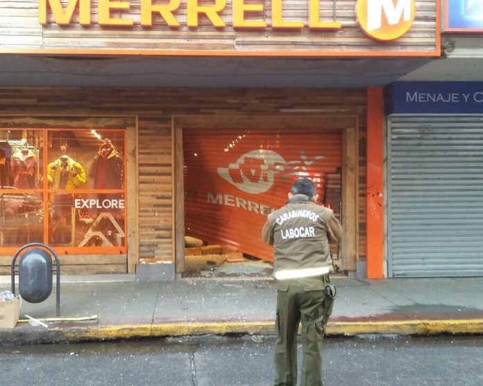 En horas de esta madrugada, un automóvil de color blanco que se desplazaba a gran velocidad por calle Camilo Henríquez con cuatro indivíduos en su interior, ingresó contra el sentido del tránsito a calle Letelier, impactando la reja metálica de la tienda Merrell, ubicada en calle O’Higgins, en pleno centro de Valdivia.