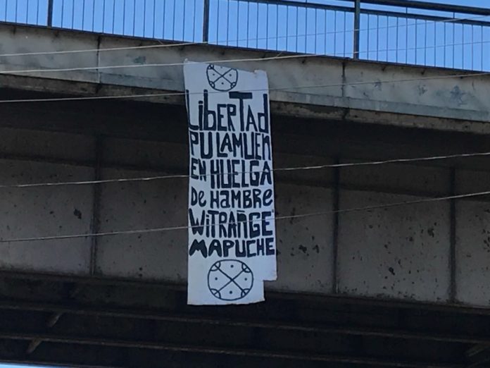 El cartel señala: “Libertad Pulamlien en Huelga de Hambre Witrañge Mapuche”.