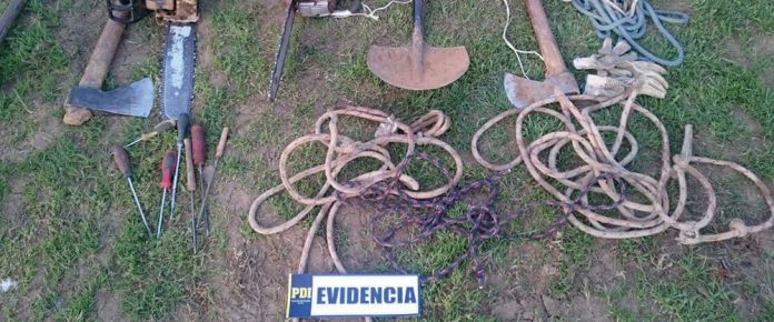 En el lugar se incautaron dos camionetas, dos motosierras, dos hachas, dos metros de madera nativa (ulmo), un vacuno de alrededor de 300 kilos, decapitado y sin sus interiores; además se incautó municiones calibre punto 22.