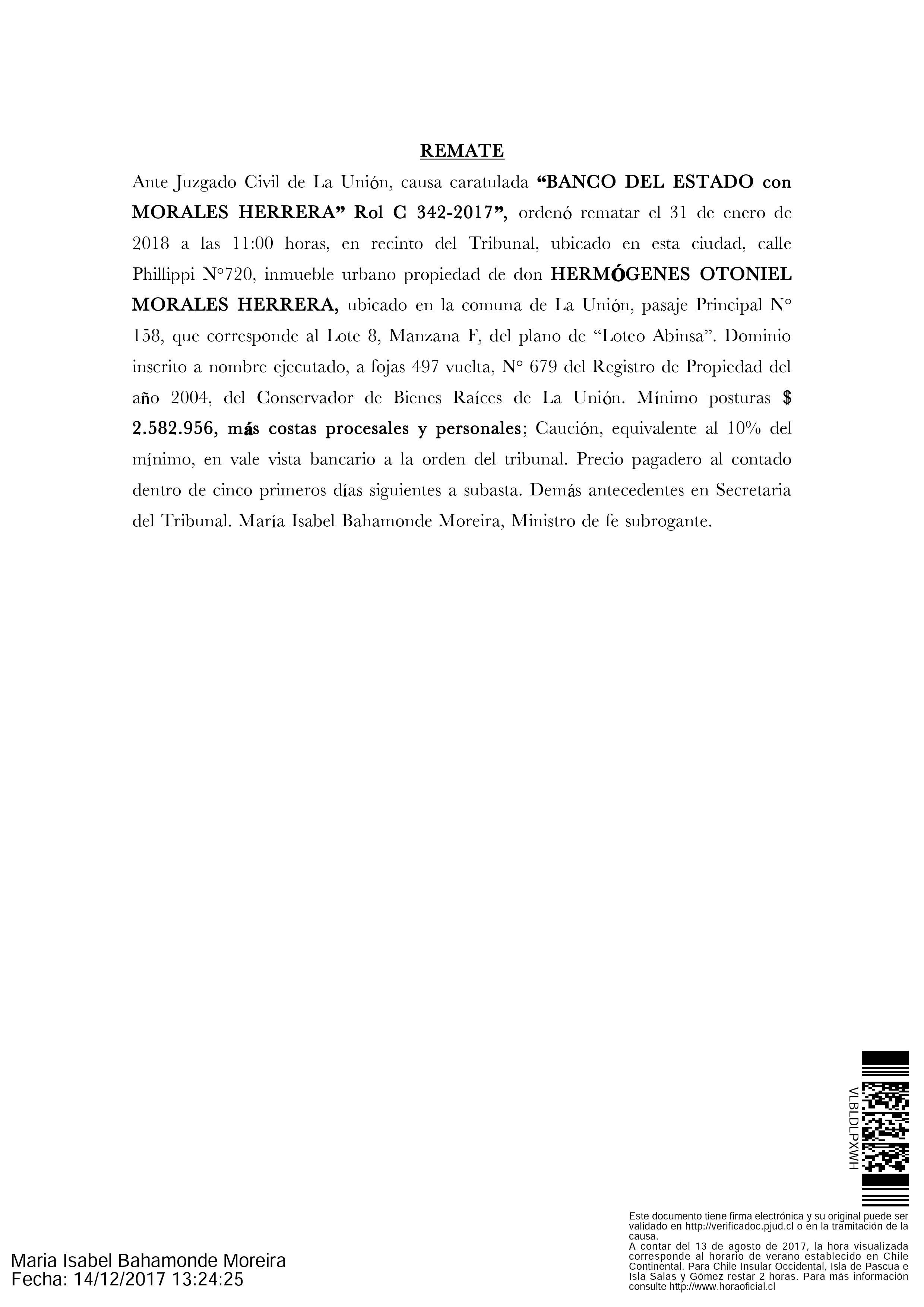 Inicio Avisos Legales Remate Causa Rol C-342-2017: Juzgado Civil de La Unión, “Banco del Estado... Avisos Legales Remate Causa Rol C-342-2017: Juzgado Civil de La Unión, “Banco del Estado con Morales Herrera” Por Equipo Prensa - 7 de enero de 2018 320 0 FacebookTwitterPinterestWhatsApp