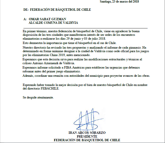 Temuco, Valdivia y Puerto Montt asomaron como candidatas para recibir a la Roja cestera, y luego de analizar las propuestas junto a efectuar una revisión de los recintos, la Federación de Básquetbol de Chile (FEBA Chile) determinó en forma unánime la elección de la capital de la región de Los Ríos como nueva casa de la Selección.