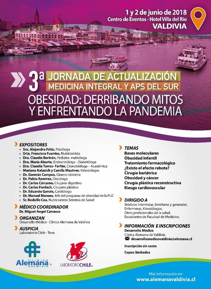 El viernes 1 y sábado 2 de junio se realizarán en el Hotel Villa del Rio de Valdivia las 3ª Jornadas de Medicina Integral y Atención Primaria de Salud del Sur, actividad organizada por Clínica Alemana de Valdivia y auspiciada por Laboratorio Chile.