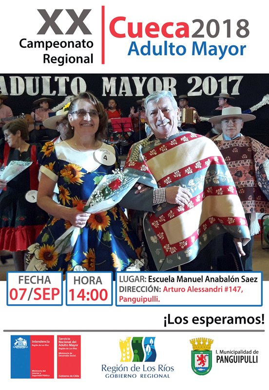 La máxima autoridad regional, César Asenjo, junto a la pareja ganadora del 2017, compuesta por Pedro Martínez Avendaño y Herminia Kunz Schmidt, anunciaron que el próximo 7 de septiembre se realizará el 20° Campeonato Regional de Cueca del Adulto Mayor en Panguipulli.