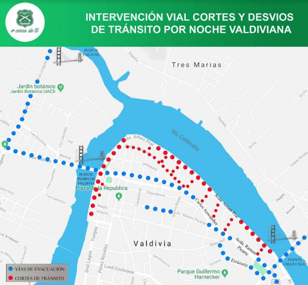 Para la tradicional noche valdiviana a realizarse el próximo sábado, Carabineros de la Zona Los Ríos implementará un completo plan de seguridad que contempla cortes de tránsito en las principales calles de la ciudad de Valdivia y las que circundan al perímetro de la costanera, además de un importante contingente de carabineros que reforzará los normales servicios preventivos dispuestos en la capital regional.