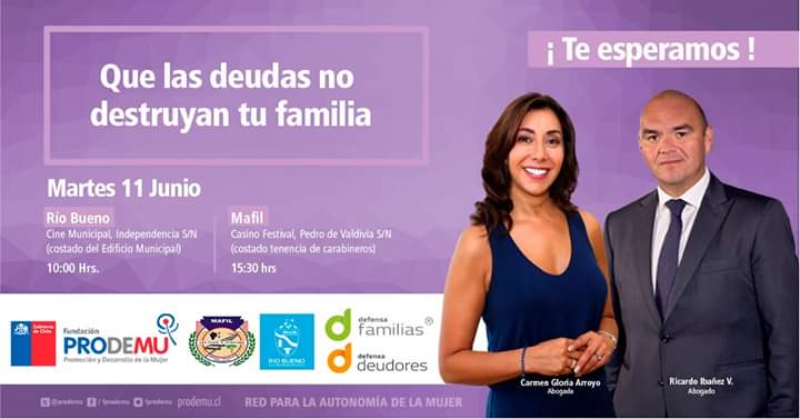 El endeudamiento puede causar estragos dentro del núcleo familiar e incluso afectar la autoestima; por esta razón, PRODEMU -institución de la red de fundaciones de la Presidencia- junto al Grupo Defensa liderado por los abogados Carmen Gloria Arroyo y Ricardo Ibáñez, se encuentran apoyando la gira “Que las Deudas no Destruyan tu Familia”.