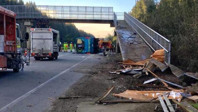 En el lugar, el conductor del bus, que se desplazaba sin pasajeros ni acompañantes, colisionó contra un paradero y posteriormente contra la pasarela peatonal habilitada en el lugar, resultando volcado.