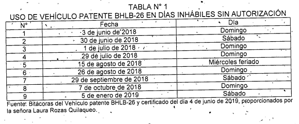 “Consultada doña Sandra Ili Raimilla, sobre el asunto, corroboró la ocurrencia de los hechos, aunque señaló que fueron muy esporádicos y por causa del desconocimiento de la normativa que regula la materia”, señala el informe. Respecto a ese mismo vehículo, se comprobó también que este no se encuentra asignado a través de un acto administrativo, como también lo exige la normativa.