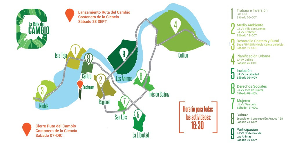 Este sábado 28 de septiembre desde las 16:30 horas en la Costanera de las Ciencias de Valdivia, y frente a un centenar de dirigentas sociales y políticas de la comuna, la candidata a alcaldesa (RD) Carla Amtmann dará inicio a la #RutaDelCambio, proceso que abrirá ocho encuentros temáticos por distintas poblaciones y sectores de la comuna que recogerán las necesidades y propuestas más urgentes de Valdivia.