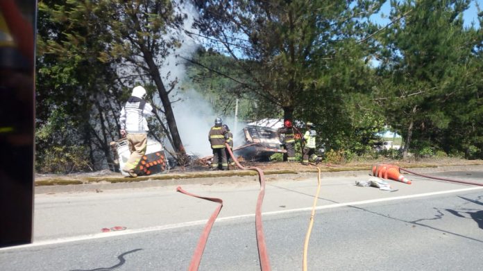 El accidente ocurrido en el kilómetro 838 de la Ruta 5 Sur se registró cerca de las 15:00 horas de este viernes, en el cual los ocupantes del camión y el vehículo (que resultaron con pérdida total) debieron salir por sus propios medios tras originarse el fuego.