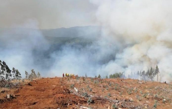 Un incendio forestal de proporciones afecta desde la tarde de este miércoles a un predio forestal en la comuna de Mariquina.