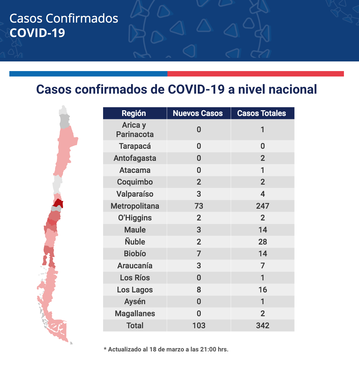 En total, hasta las 21 horas de ayer miércoles se registran 103 casos nuevos en el país, alcanzando un total de 342 casos. De ellos seis se mantienen con ventilación mecánica, y hasta el momento no se registran decesos.