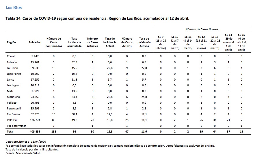 Asimismo, existen inconsistencias en la información relativa a Río Bueno, ya que hasta el 12 de abril -según el informe del MINSAL- se registran 10 casos en esa comuna, cuando a nivel regional se reportaban 7, cifra que se mantiene hasta hoy según lo informado por la seremi Regina Barra.
