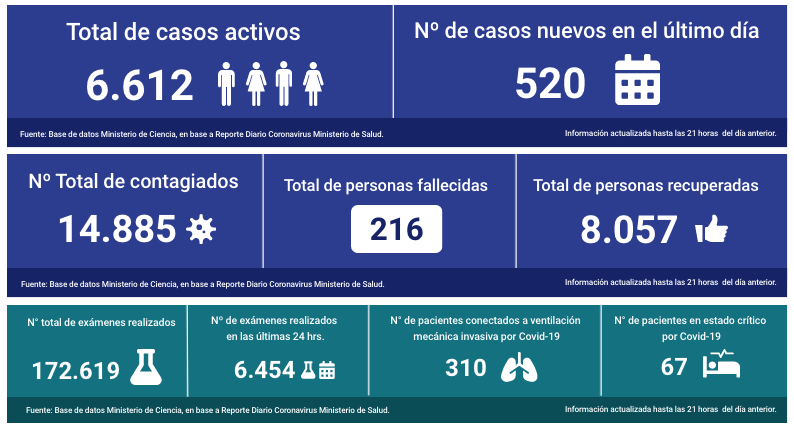 El Ministerio de Salud informó que hasta las 21:00 horas de ayer se registraron 520 nuevos casos de coronavirus, dejando en 14.885 la cifra total de contagiados por la pandemia en Chile.