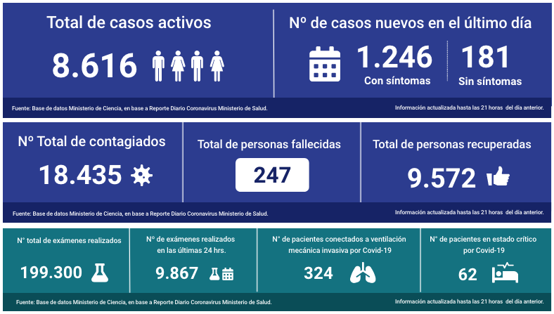 Del total de casos confirmados hasta el momento, 8.616 se mantienen activos, 9.572 se han recuperado y 247 han fallecido, 13 en las últimas 24 horas.