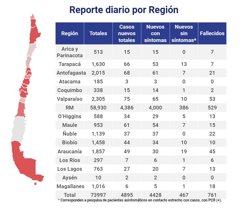 La Autoridad Sanitaria detalló que en las últimas 24 horas se registraron 4.895 nuevos casos de coronavirus, de los cuales 4.428 presentaron síntomas y 467 son asintomáticos. 29.302 personas se han recuperado de esta enfermedad, mientras que 43.934 permanecen activos.