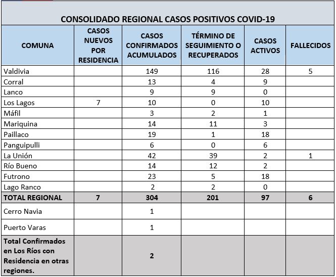 De este modo, la Región de Los Ríos suma 304 casos confirmados acumulados por residencia. De estos casos, 201 personas se han recuperado, y 97 casos se mantienen activos.