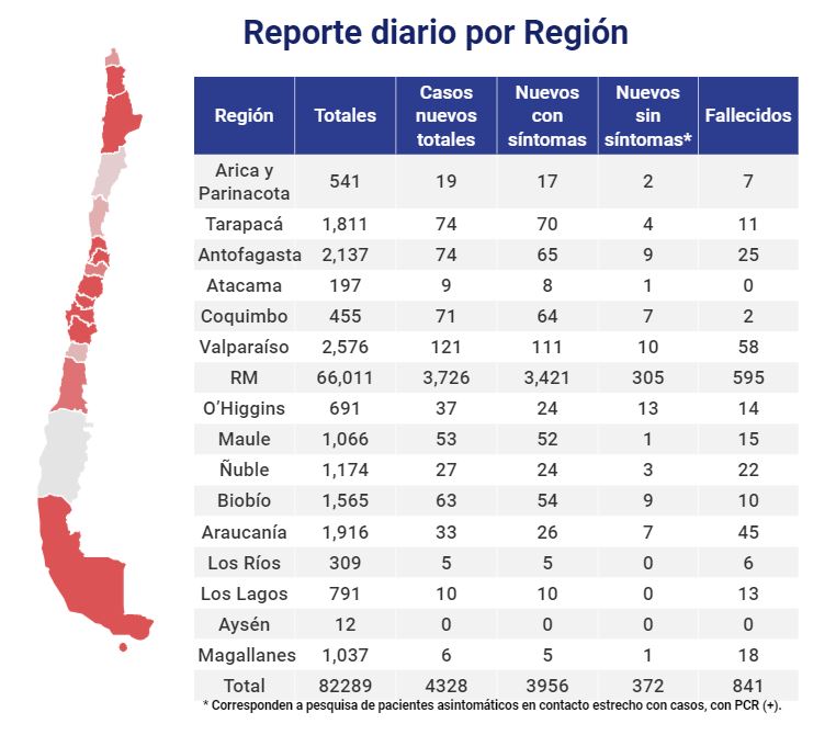 La Autoridad Sanitaria detalló que en las últimas 24 horas se registraron 4.328 nuevos casos de coronavirus, de los cuales 3.956 presentaron síntomas y 372 son asintomáticos. 33.540 personas se han recuperado de esta enfermedad, mientras que 47.908 permanecen activos.