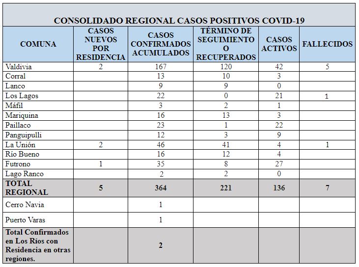 De este modo, la Región de Los Ríos suma 364 casos confirmados acumulados por residencia. De estos casos, 221 personas se han recuperado, y 136 casos se mantienen activos.