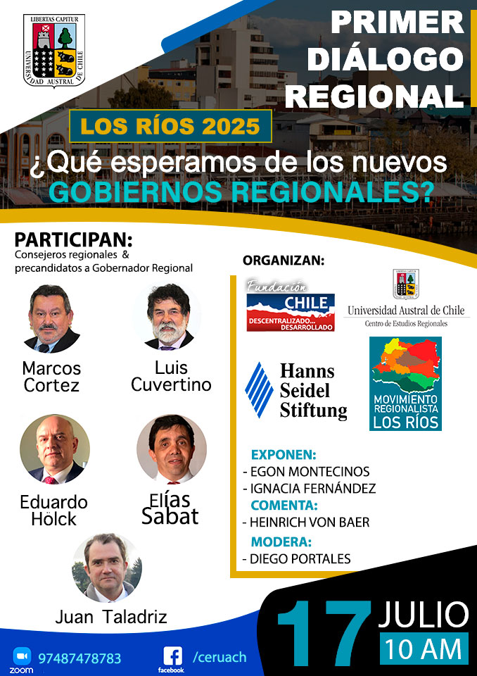 “Qué esperamos de los nuevos gobiernos regionales”, se denomina el evento académico que reunirá a diversos actores de la arena política regional, en el Primer Diálogo Regional impulsado por la UACh, la Fundación Chile Descentralizado, el Movimiento Regionalista de Los Ríos y la Fundación Hanns Seidel Stiftung.