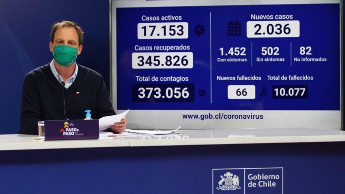 En un nuevo reporte sobre la situación del COVID-19 en Chile, el Ministerio de Salud informó de 2.036 nuevos casos (1.542 sintomáticos, 502 sin síntomas y 82 no informados). Con esto, el total de contagios en el país llega a 373.056, de los cuales 17.153 se encuentran activos.