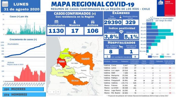 De esta manera, la región de Los Ríos a la fecha mantiene 106 casos activos por residencia, de los cuales 47 corresponden a la comuna de Valdivia; 16 a la comuna de Río Bueno; 15 a la comuna de Lanco; 14 a la comuna de Panguipulli; 7 a la comuna de Mariquina; 3 a la comuna de La Unión; 2 a las comunas de Paillaco y Máfil. Las comunas de Corral, Lago Ranco, Futrono y Los Lagos no presentan casos activos a la fecha.