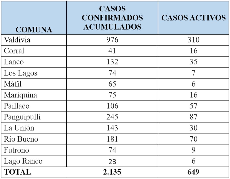 De esta manera, la Región de Los Ríos a la fecha mantiene 649 casos activos por residencia, de los cuales 310 corresponden a Valdivia; 87 a Panguipulli; 70 a Río Bueno; 57 a Paillaco; 35 a Lanco; 30 a La Unión; 16 a Corral y Mariquina, respectivamente; nueve a Futrono; siete a Los Lagos; y seis a Lago Ranco y Máfil, por cada comuna.