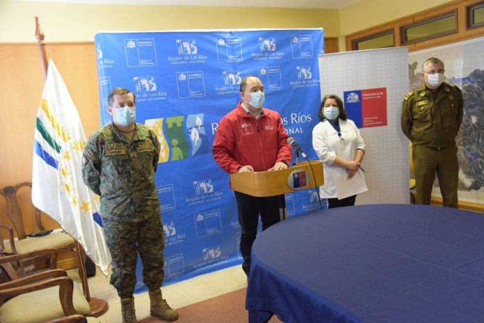 El intendente de Los Ríos, César Asenjo, junto al el jefe de la Defensa Nacional, general Guillermo Sánchez; el jefe de la XIV Zona de Carabineros, general Iván Ketterer; y la seremi de Salud, Regina Barra, realizaron un balance del fin de semana, en el que nueve de las 12 comunas de la región debieron cumplir cuarentena obligatoria por encontrarse en fase 2 del plan Paso a Paso Nos Cuidamos.