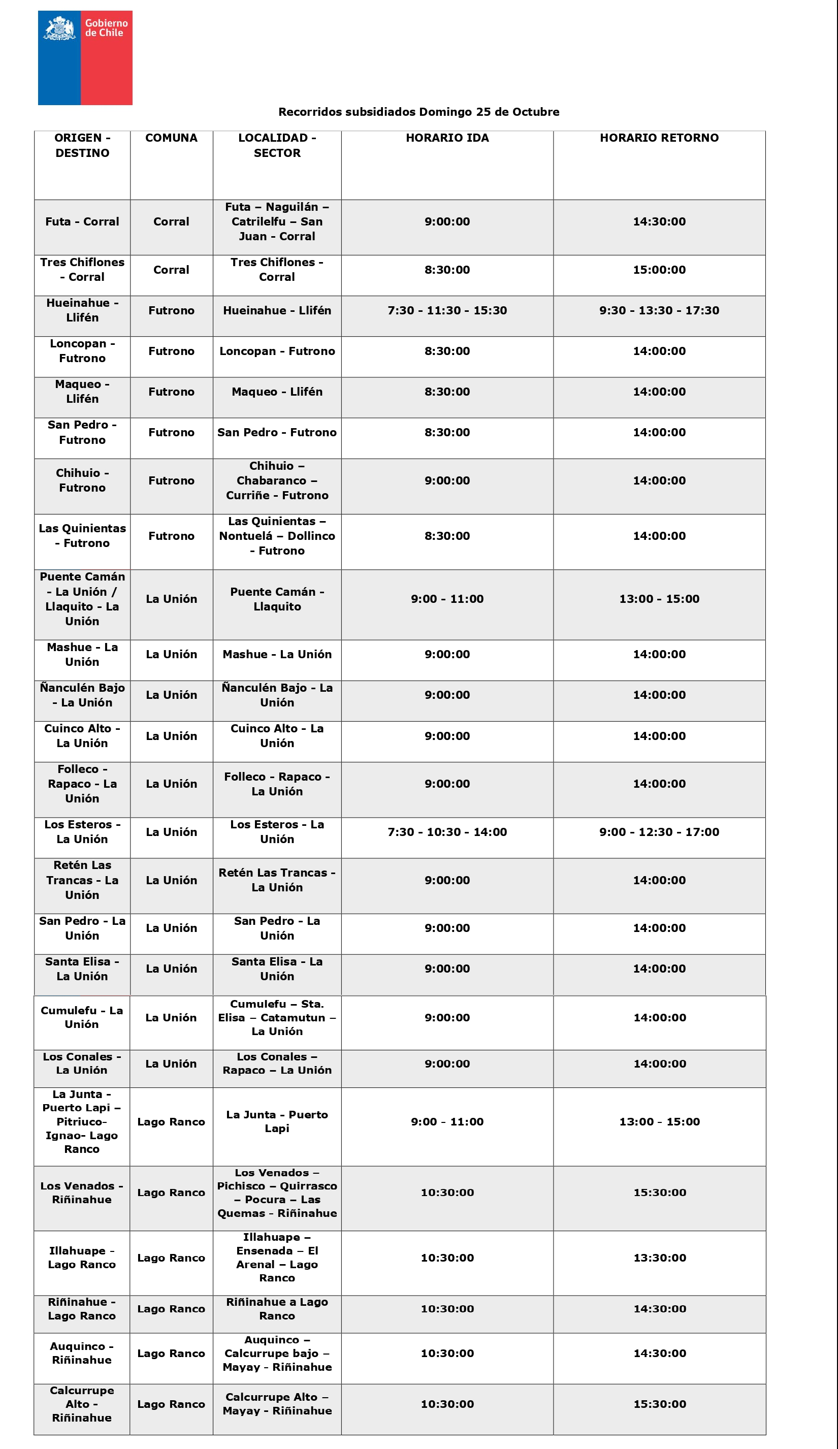 Se trata de 75 recorridos operativos en la región de manera gratuita del Ministerio de Transportes y Telecomunicaciones, que junto a 94 servicios complementarios contratados desde el Gobierno Regional, entregarán cobertura en las 12 comunas de Los Ríos.