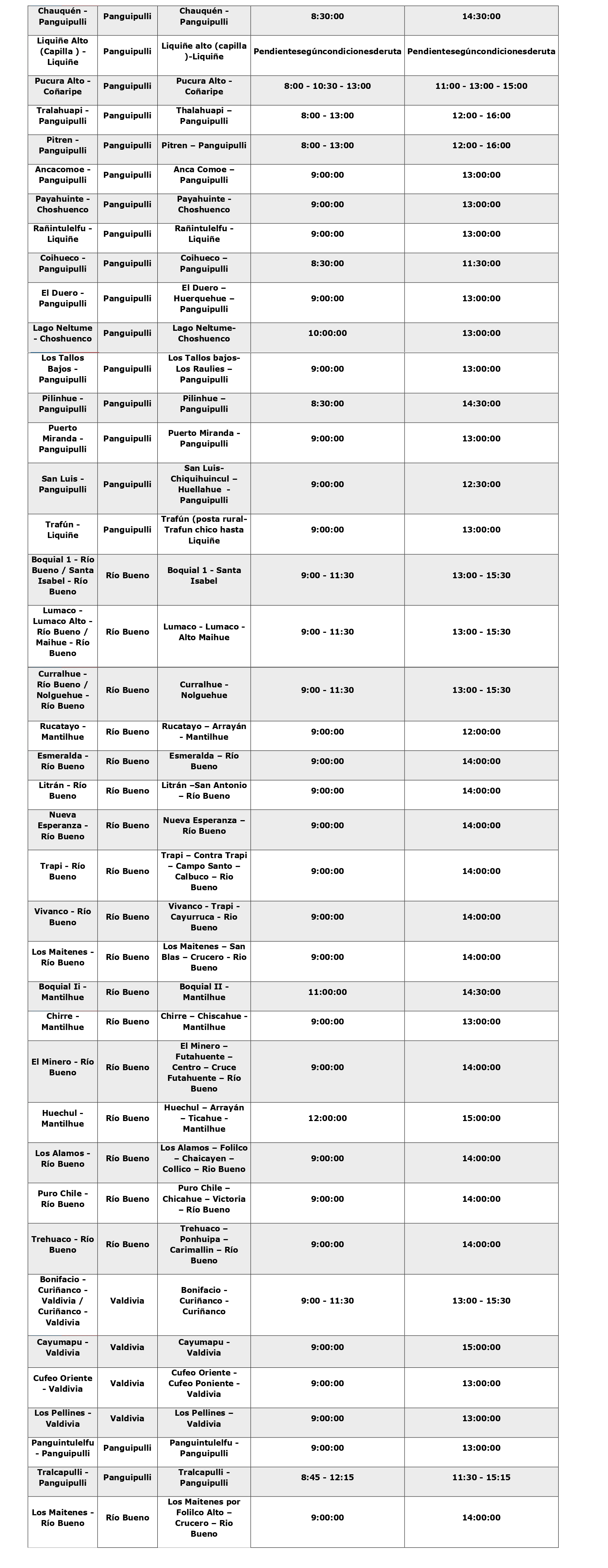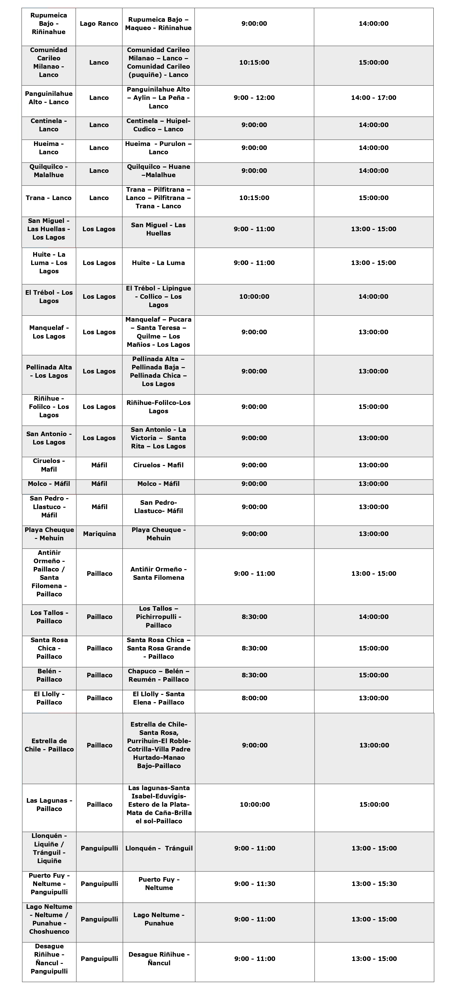 Además, la autoridad del MTT en la zona, informó que los horarios de cada servicio pueden ser modificados y coordinados directamente desde las comunidades con el operador correspondiente, en función a sus necesidades.