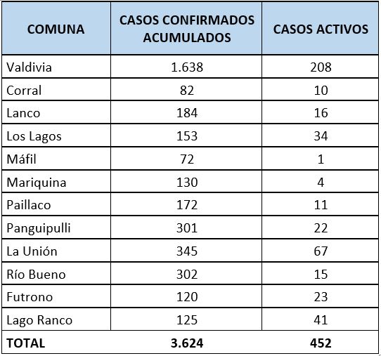De esta manera, la Región de Los Ríos a la fecha mantiene 452 casos activos por residencia, de los cuales 208 corresponden a Valdivia; 67 a La Unión; 41 a Lago Ranco; 34 a Los Lagos; 23 a Futrono; 22 a Panguipulli; 16 a Lanco; 15 a Río Bueno; 11 a Paillaco; 10 a Corral; cuatro a Mariquina; y uno a Máfil.