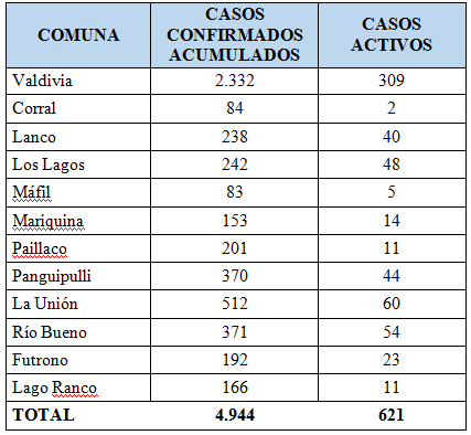 Se trata de 40 casos en la comuna de Valdivia, de los cuales cuatro están sin trazabilidad y dos aún se encuentran en investigación; 13 casos secundarios en la comuna de Los Lagos; 9 casos en la comuna de Río Bueno, uno de ellos aún en investigación; 6 casos en la comuna de Futrono, tres de los cuales se encuentran en investigación; 5 casos secundarios en la comuna de Panguipulli; 3 casos en la comuna de La Unión, de ellos dos están sin trazabailidad; 2 casos secundarios en la comuna de Paillaco; 2 casos secundarios en la comuna de Lago Ranco; 1 caso secundario en la comuna de Lanco y 1 caso secundario en la comuna de Mariquina.