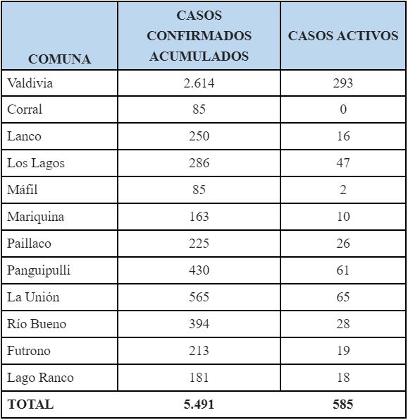 Se trata de 51 casos en Valdivia; 13 contagios en Panguipulli; 12 personas en Futrono; 11 casos en Los Lagos; seis contagios en Paillaco; tres personas en La Unión y Lago Ranco, respectivamente; dos casos en Río Bueno; y un contagio en Mariquina.