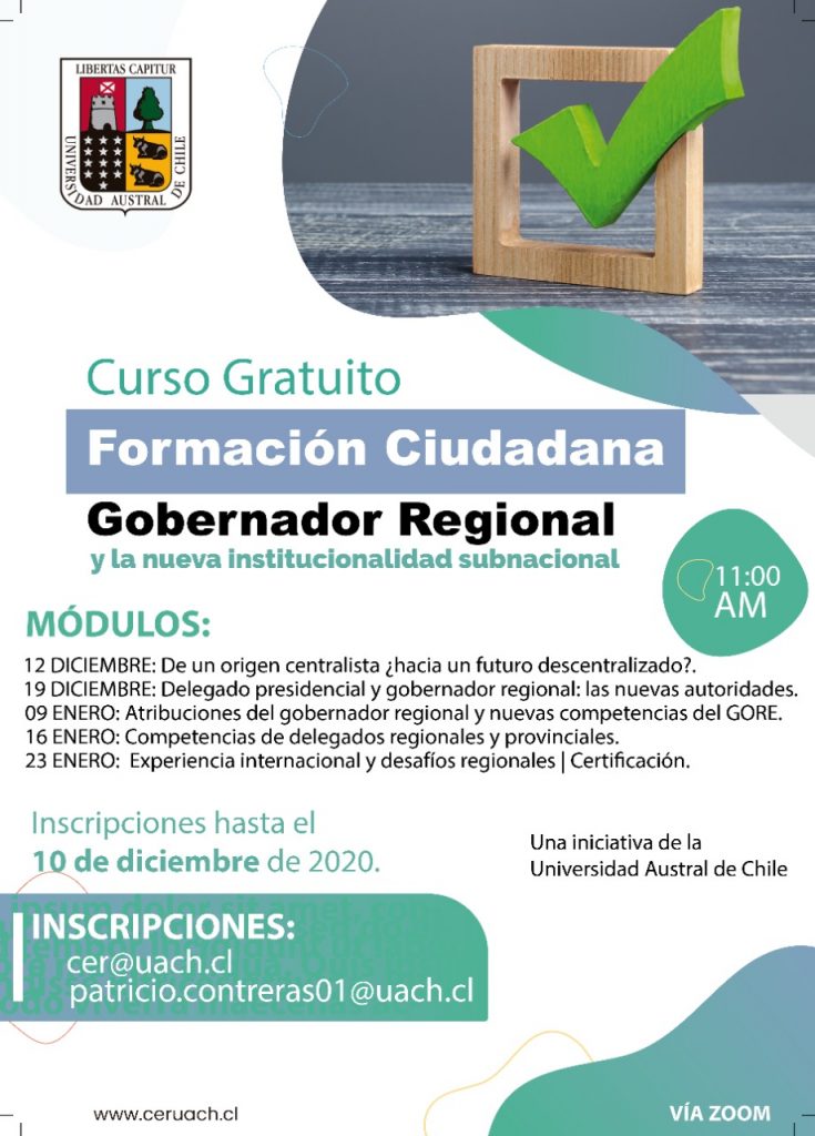 Este curso gratuito en el que podrán participar ciudadanos y ciudadanas de todo el país, será ofrecido a través del Centro de Estudios Regionales de la UACh, que cuenta con un equipo multidisciplinario, académicos e investigadores destacados en el ámbito público. Quienes deseen participar podrán inscribirse antes del 10 de diciembre enviando un mail a cer@uach.cl o a patricio.contreras01@uach.cl.