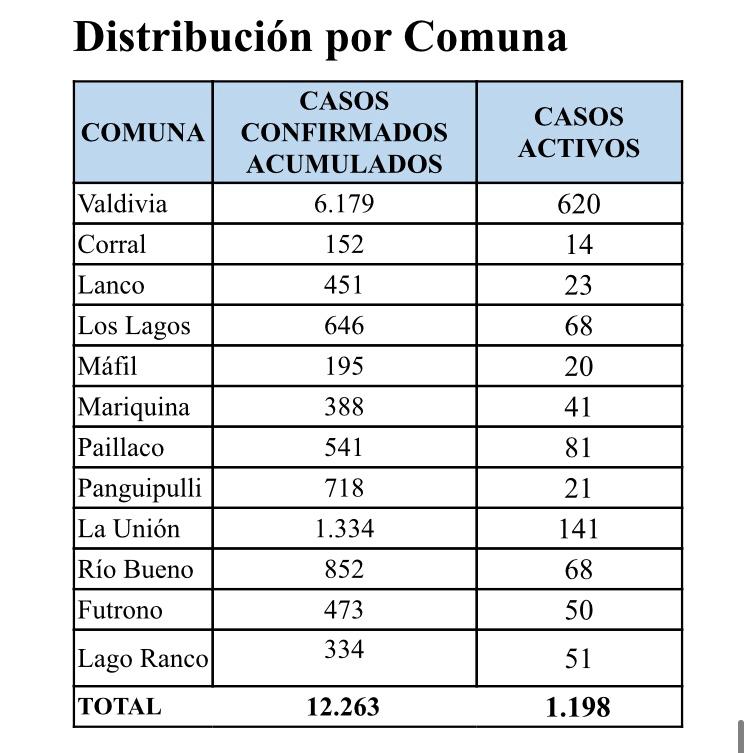 Según el informe oficial, se registran 98 nuevos casos en la comuna de Valdivia, 43 casos en la comuna de La Unión, 24 casos en la comuna de Futrono, 16 casos en la comuna de Río Bueno, 16 casos en la comuna de Paillaco, 6 casos en la comuna de Panguipulli, 5 casos en la comuna de Lago Ranco, 4 casos en las comunas de Mariquina, 3 casos en la comuna de Lanco y 1 casos en la comuna de Los Lagos.