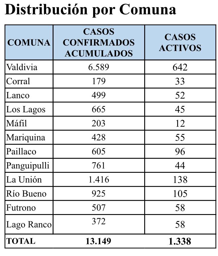 Según el informe oficial, se registran 117 nuevos casos en la comuna de Valdivia, 19 casos en la comuna de Paillaco, 15 casos en la comuna de Mariquina, 15 casos en la comuna de Río Bueno, 13 casos en la comuna de Panguipulli, 12 casos en la comuna de La Unión, 8 casos en la comuna de Los Lagos, 7 casos en la comuna de Corral, 5 casos en la comuna de Lago Ranco, 4 casos en la comuna de Máfil, 3 casos en la comuna de Futrono y 2 casos en la comuna de Lanco.