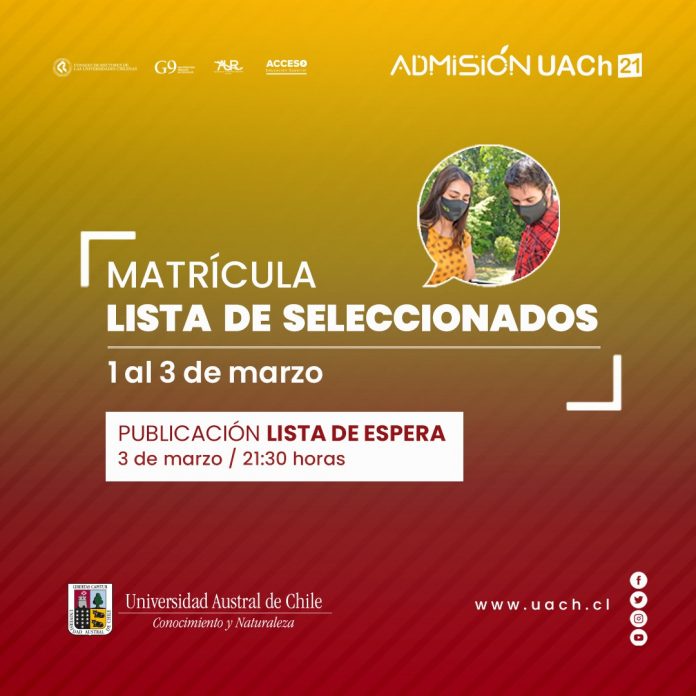 Desde el 1 al 3 de marzo se podrán matricular quienes sean seleccionadas y seleccionados en las carreras de la Universidad Austral de Chile. El proceso será online a través de www.uach.cl y pueden revisar los requisitos en el Instructivo de Matrículas para Estudiantes Ingreso 2021: https://www.uach.cl/uach/_file/instructivo-de-matricula-admison-2021-601af6344dafa.pdf