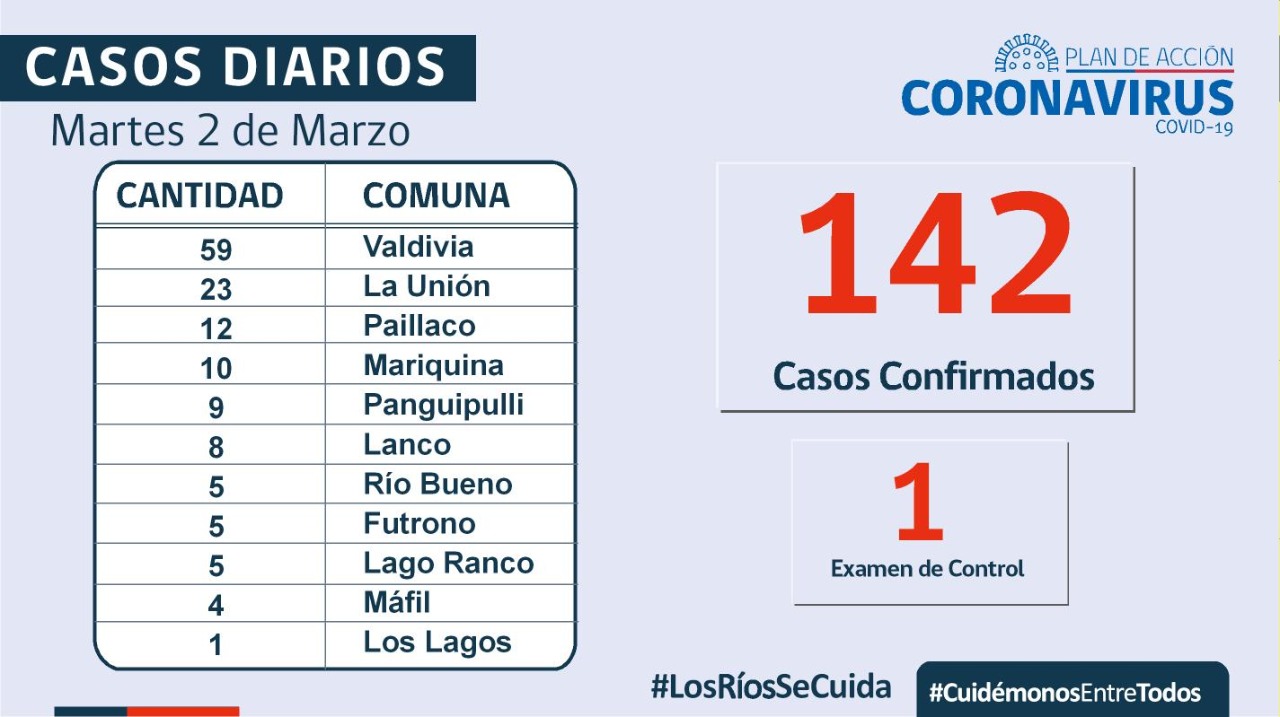 Según el informe oficial, se registran 59 nuevos casos en la comuna de Valdivia, 23 casos en la comuna de La Unión, 12 casos en la comuna de Paillaco, 10 casos en la comuna de Mariquina, 9 casos en la comuna de Panguipulli, 8 casos en la comuna de Lanco, 5 caso en la comuna de Río Bueno, Lanco y Futrono, 4 casos en la comuna de Máfil y 1 caso la comuna de Los Lagos.