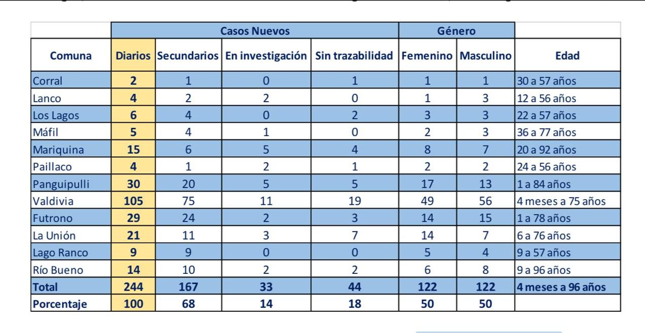 Según el informe oficial, se registran 105 nuevos casos en la comuna de Valdivia, 30 casos en la comuna de Panguipulli, 29 casos en la comuna de Futrono, 21 casos en la comuna de La Unión, 15 casos en la comuna de Mariquina, 14 casos en la comuna de Río Bueno, 9 caso en la comuna de Lago Ranco, 6 casos en la comuna de Los Lagos, 5 casos en la comuna de Máfil, 4 casos en la comuna de Lanco, 4 casos en la comuna de Paillaco y 2 casos en la comuna de Corral.
