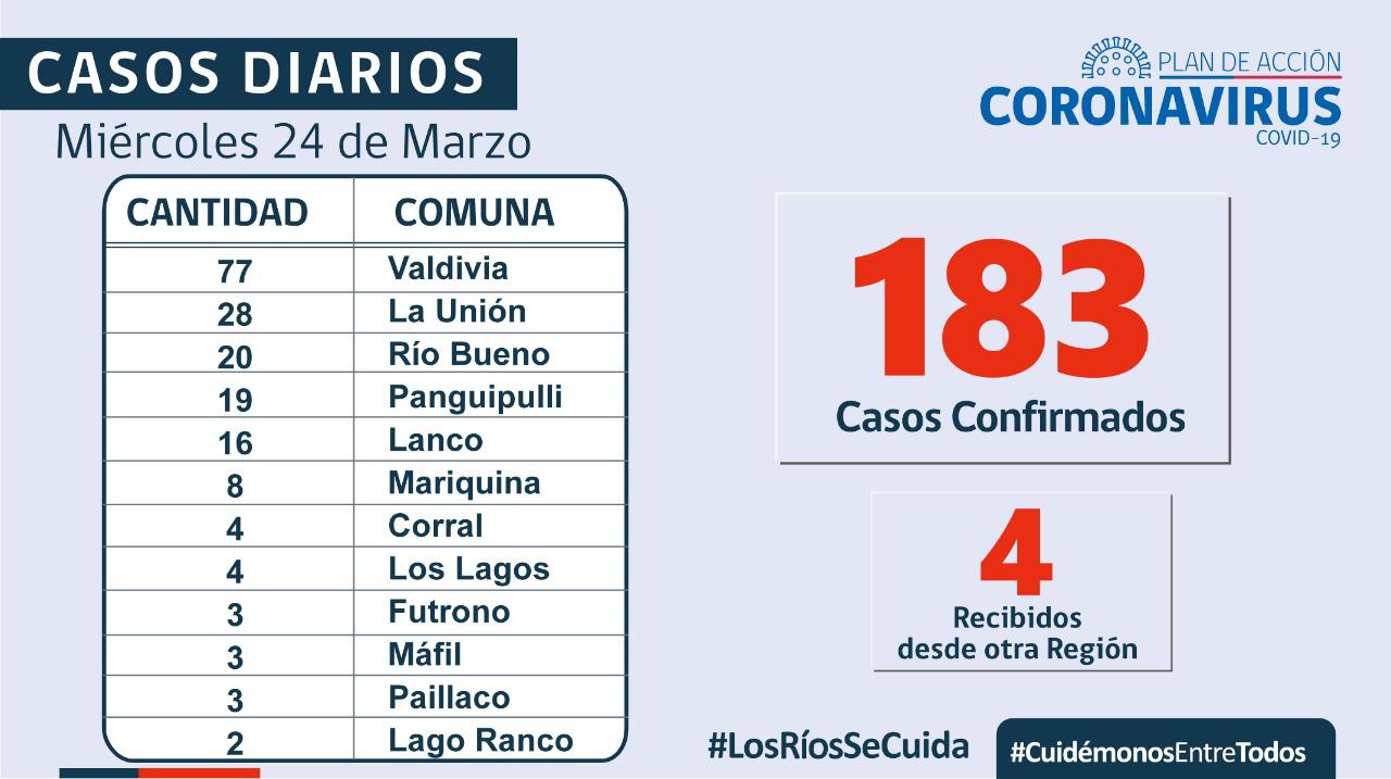 Según el informe oficial, se registran 77 nuevos casos en la comuna de Valdivia, 28 casos en la comuna de La Unión, 20 casos en la comuna de Río Bueno, 19 casos en la comuna de Panguipulli, 16 casos en la comuna de Corral, 4 casos en la comuna de Los Lagos, 3 casos en la comuna de Futrono, 3 casos en la comuna de Máfil, 3 casos la comuna de Paillaco y 2 casos en la comuna de Lago Ranco.