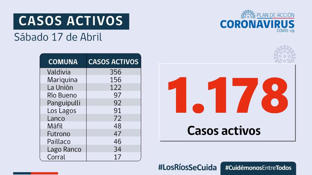 Según el informe oficial, se registran 40 casos en la comuna de Valdivia, 36 nuevos casos en la comuna de Mariquina, 28 casos en la comuna de Los Lagos, 20 casos en la comuna de La Unión, 11 casos en la comuna de Lago Ranco, 10 casos en la comuna de Lanco, 9 casos en la comuna de Futrono, 8 casos en la comuna de Río Bueno, 8 casos en la comuna de Paillaco, 4 casos en la comuna de Máfil y 3 caso en las comunas de Corral.