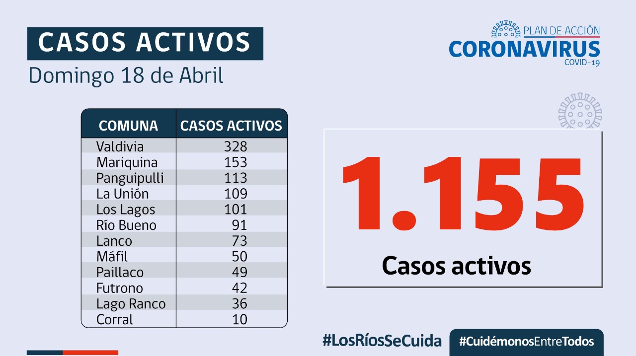 Según el informe oficial, se registran 53 casos en la comuna de Valdivia, 39 nuevos casos en la comuna de Panguipulli, 32 casos en la comuna de Mariquina, 22 casos en la comuna de Los Lagos, 15 casos en la comuna de La Unión, 12 casos en la comuna de Lanco, 11 casos en la comuna de Río Bueno, 9 casos en la comuna de Máfil, 7 casos en la comuna de Lago Ranco, 7 casos en la comuna de Paillaco y 3 casos en la comuna de Futrono.
