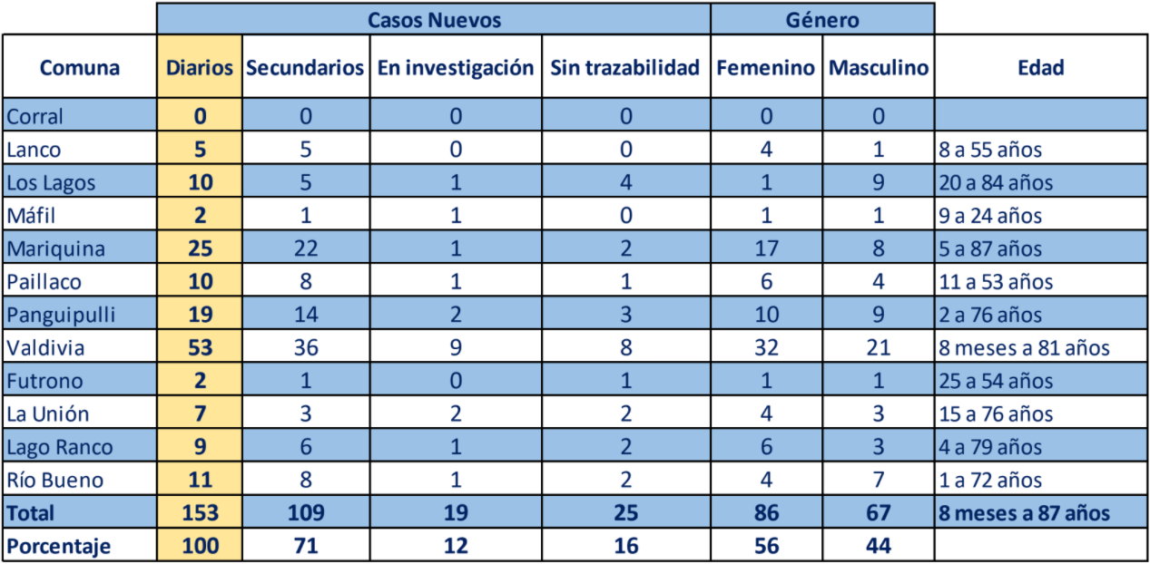 De los 153 casos confirmados por residencia en Los Ríos, 109 corresponden a casos secundarios, 25 aún están sin trazabilidad y 19 se encuentran en investigación. En tanto, a la fecha, la región presenta 36.285 casos acumulados, de los cuales 908 corresponden a casos activos, 35.003 a personas recuperadas y 374 a fallecidos.