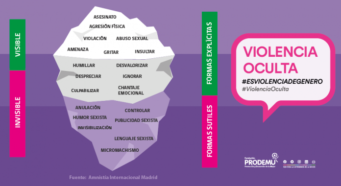 En el “iceberg de la violencia”, hay manifestaciones muchas veces imperceptibles por el entorno, que si no son detectadas o frenadas a tiempo pueden dar paso a la violencia física, es decir a la parte visible del iceberg. Otro aspecto que aborda esta campaña, es que las situaciones que se presentan, tienden a encubrirse bajo las formas de subjetivación del amor romántico, justificadas por considerarse –de forma equivocada- expresiones de amor.