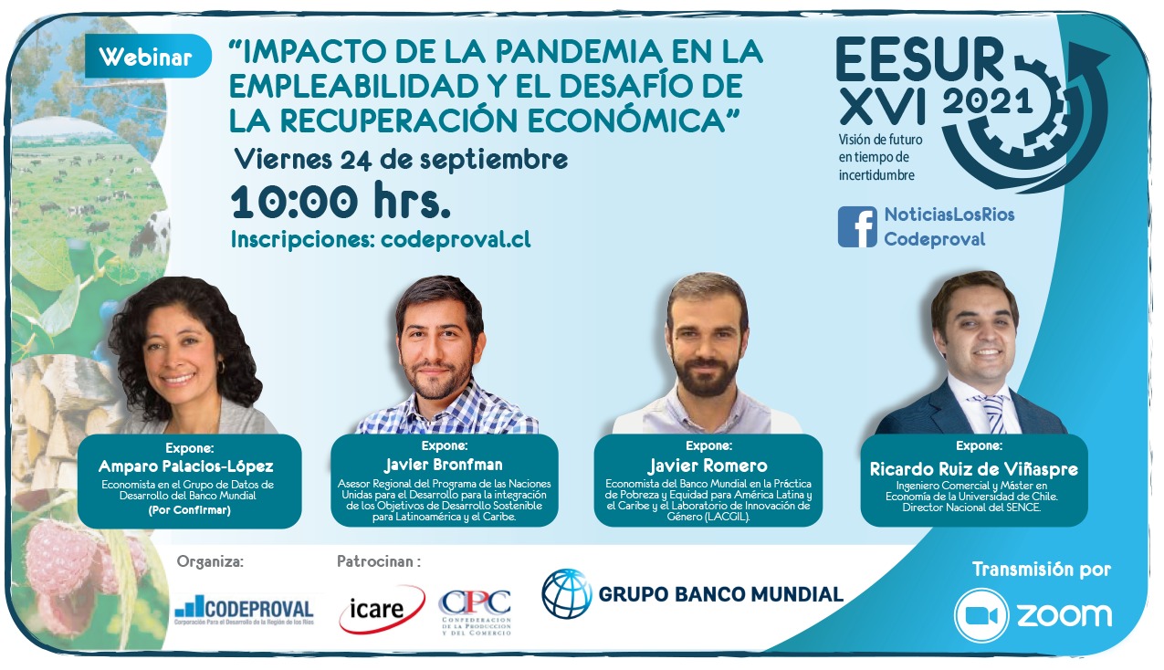 Con la participación de destacados expositores del Banco Mundial se realizará el tercer webinar del Encuentro Empresarial del Sur, EESUR, – organizado por Codeproval- denominado “Impacto de la Pandemia en la empleabilidad y el desafío de la recuperación económica”. La actividad, se efectuará este viernes 24 a contar de las 10 horas vía zoom y también participará el director nacional del Sence, Ricardo Ruiz de Viñaspre.