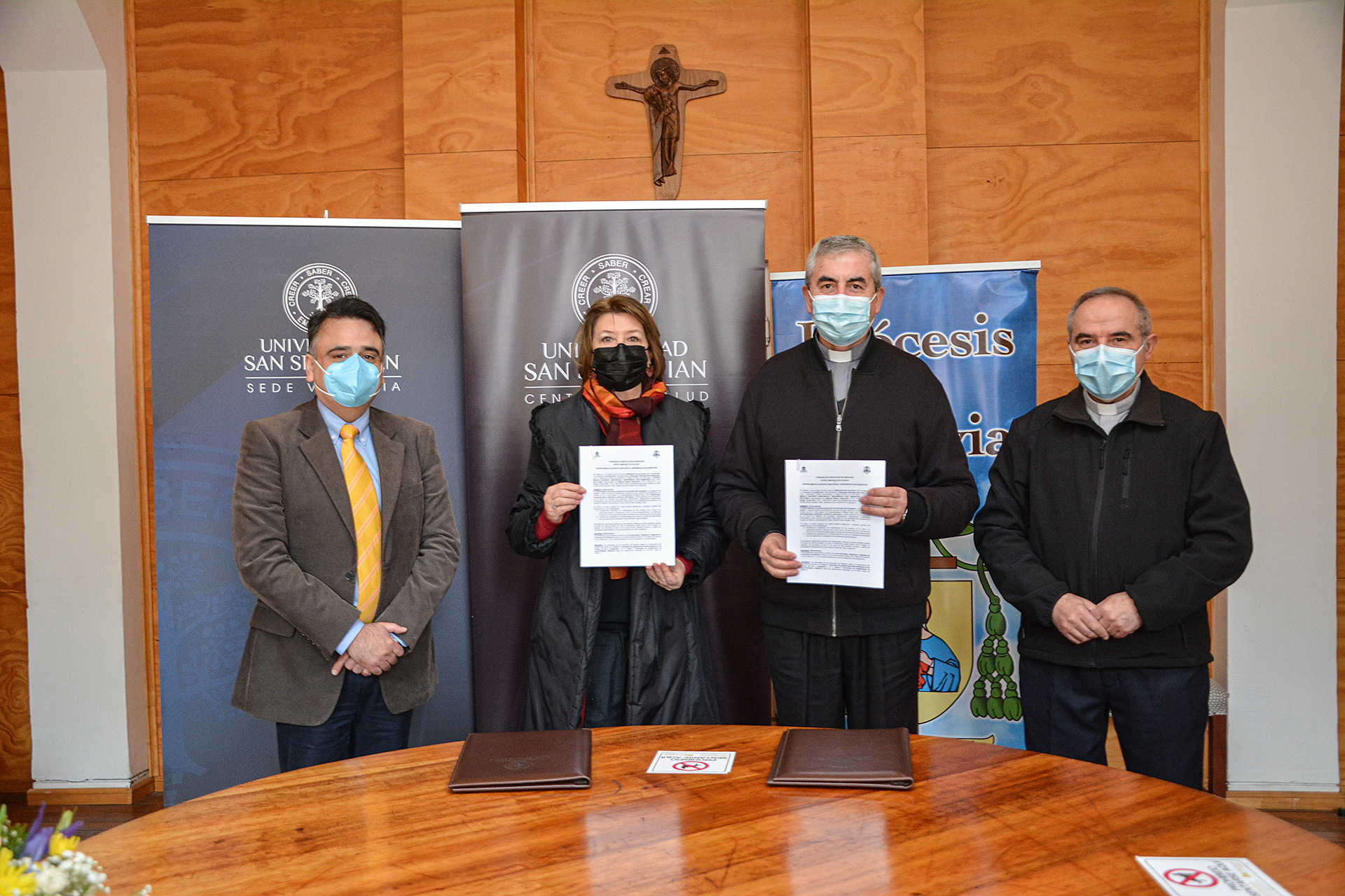 La Vicerrectora de la USS Valdivia, María Angélica Hildebrandt y el Obispo de Valdivia, Santiago Silva, firmaron un convenio para que religiosos y religiosas de la Diócesis de Valdivia puedan acceder a consultas, evaluaciones, diagnósticos, tratamientos individuales y otros servicios que presta el Centro de Salud (CSUSS) de la Casa de Estudios, con aranceles preferenciales.