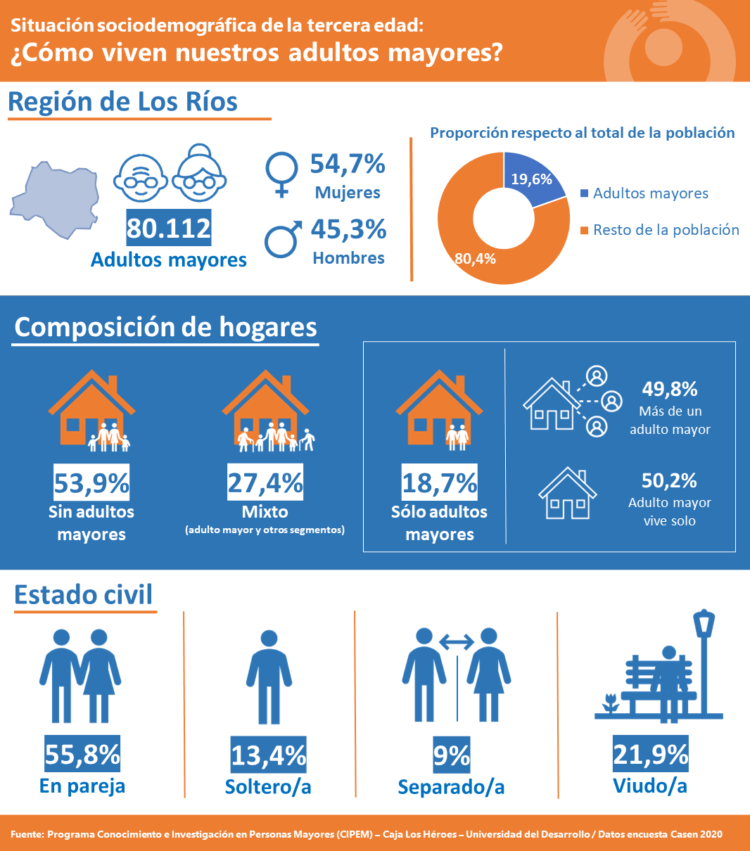Con el objetivo de caracterizar la forma en la que viven actualmente los más de 3,4 millones de adultos mayores en el país, el programa de Conocimiento e Investigación en Personas Mayores (Cipem) analizó los datos de la última encuesta Casen, donde se revela que en la región de Los Ríos el 18,7% de los hogares está compuesto sólo por adultos mayores, siendo la cuarta zona del país con la más alta proporción. Junto con esto, de los hogares compuestos sólo por individuos de la tercera edad, en un 50,2% la persona vive sola.