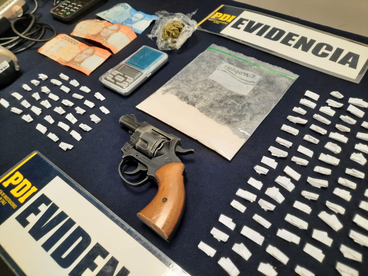 En la diligencia policial, fueron incautados 2 computadores, 3 máquinas de Transbank, una balanza para dosificar droga, 39,61 gramos de Cocaína Base, dosificado en 128 envoltorios de papel blanco cuadriculado y 8,88 gramos de Cannabis Sativa. Además de un arma a fogueo que será periciada para determinar si ha sido modificada para utilizar munición letal , y 50 mil pesos en dinero efectivo producto de la venta de drogas.