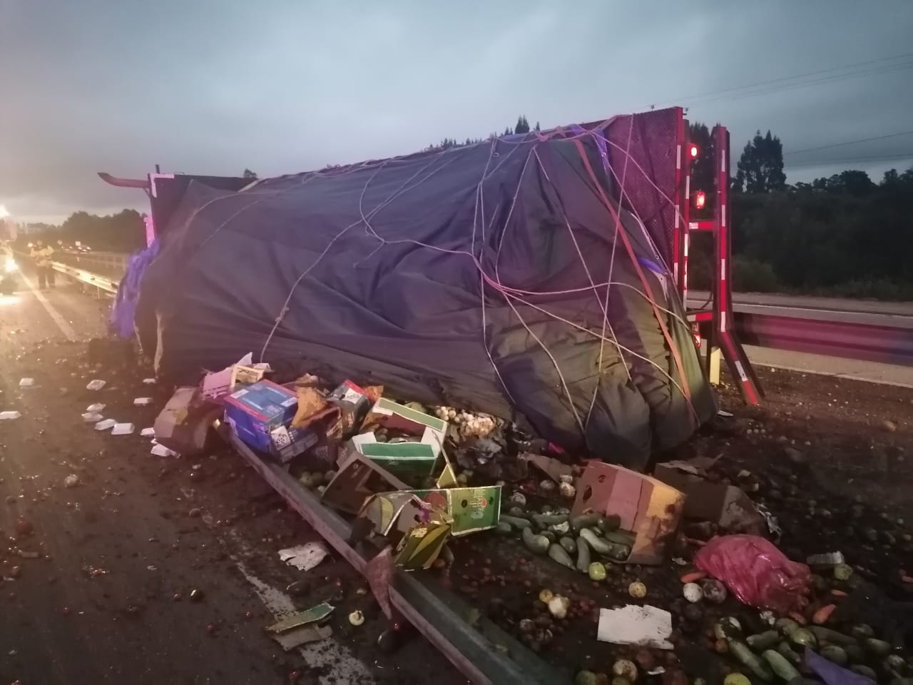 Esta madrugada pasada las 05:00 AM, un camión que transportaba frutas volcó a la altura del KM 864 en la ruta 5 Sur. Según información entregada por el Teniente Coronel de Carabineros de La Unión, Luis Rebolledo, a la llegada del personal policial, se logró constatar que el vehículo se encontraba volcado en los durmientes centrales de la calzada, y que en su interior se encontraban dos ocupantes, los cuales presentaban lesiones de carácter leve.